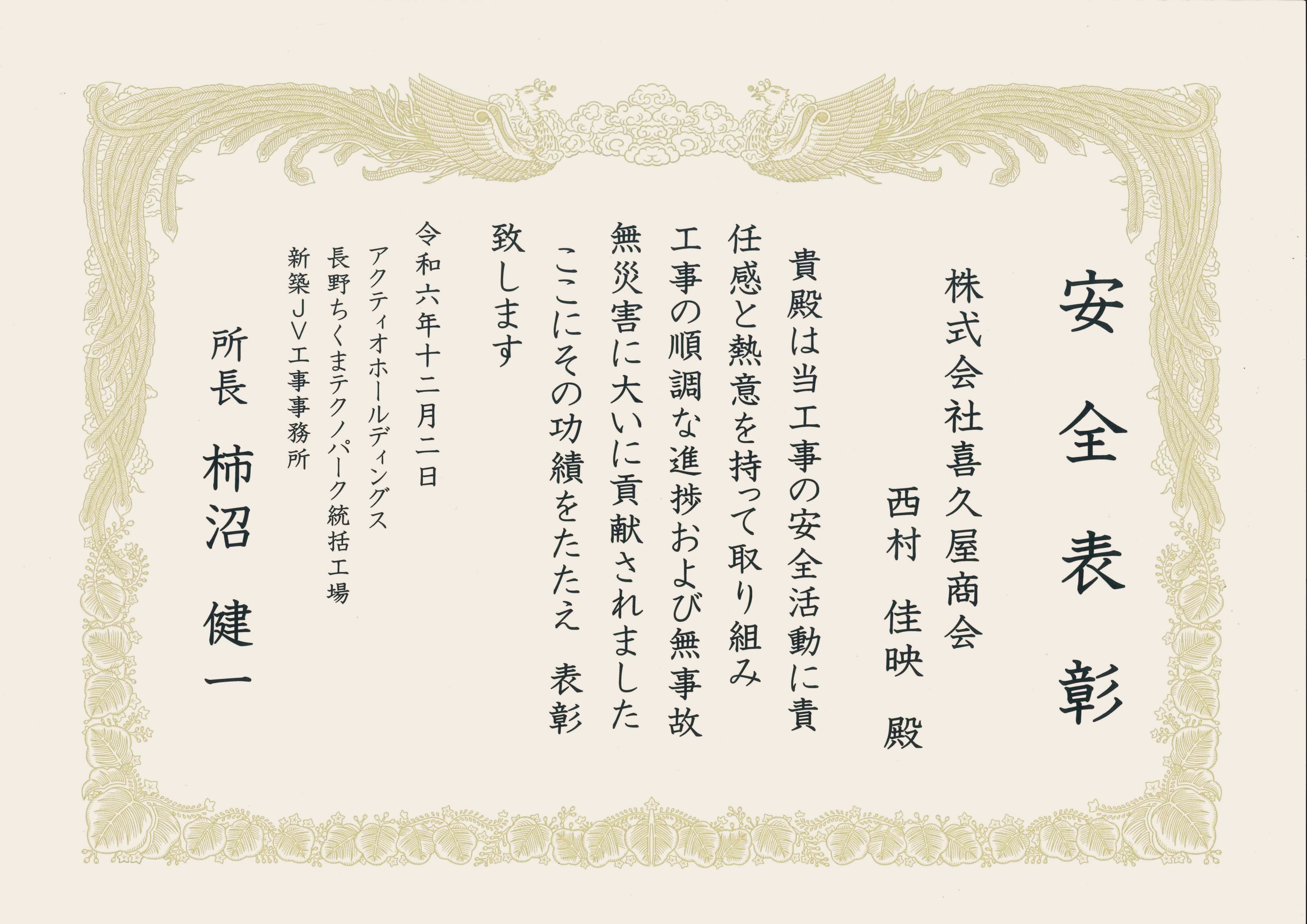 そして現場事務所さまより「安全表彰」を頂きました。